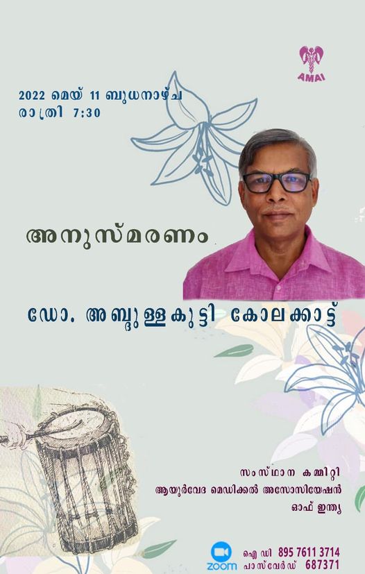 ഡോക്ടറോടുള്ള ആദരസൂചകമായി അദ്ദേഹത്തിന്റെ നിര്യാണത്തിൽ ആദരാഞ്ജലികൾ അർപ്പിച്ചു കൊണ്ട് ആയുർവേദ മെഡിക്കൽ അസോസിയേഷൻ സംസ്ഥാനകമ്മറ്റി സംഘടിപ്പിക്കുന്ന അനുശോചന സമ്മേളനം 11/5/2022 ബുധൻ വൈകിട്ട് 7 30ന് ഓൺലൈനായിചേരുന്നു .